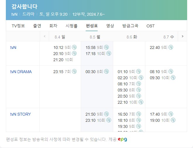 이 채널들은 다양한 시간대에 감사합니다 재방송을 편성하여 시청자들이 드라마를 놓치지 않고 다시 볼 수 있도록 하고 있습니다. 채널별 편성표를 확인하여 원하는 시간에 감사합니다 드라마를 즐기시기 바랍니다.