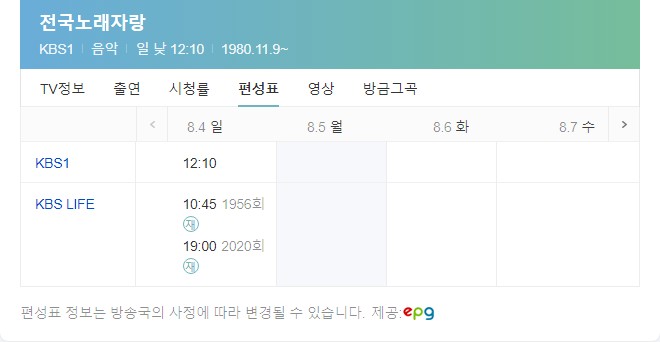 전국노래자랑 재방송은 KBS LIFE 채널에서 재방송이 진행됩니다. 각 채널별 재방송 편성 시간은 다르므로, 원하는 시간에 맞춰 시청할 수 있습니다.
